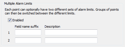 1. Use the Field Name Suffix fields to define the names of the two database fields that will represent the two sets of alarm limits.