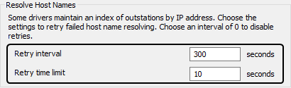 Certain advanced drivers maintain an index of network outstations using their IP addresses. This enables the driver to locate a specific outstation based on an IP address. The host addresses of outstations might be either names (for example, domain names or NetBIOS names) or numeric addresses (for example, 10.141.114.116) (see Define an Outstation’s Network Properties). When names are used the names need to be resolved into IP addresses (for example, using DNS), and as this may fail it may need to be retried. You can use the Geo SCADA Expert Server Configuration Tool to define the settings to retry host name resolution.