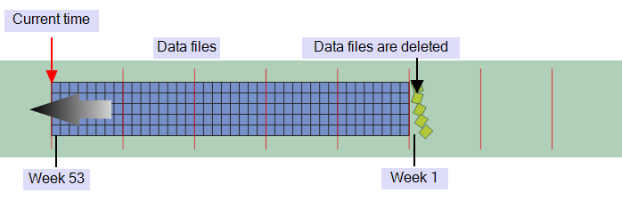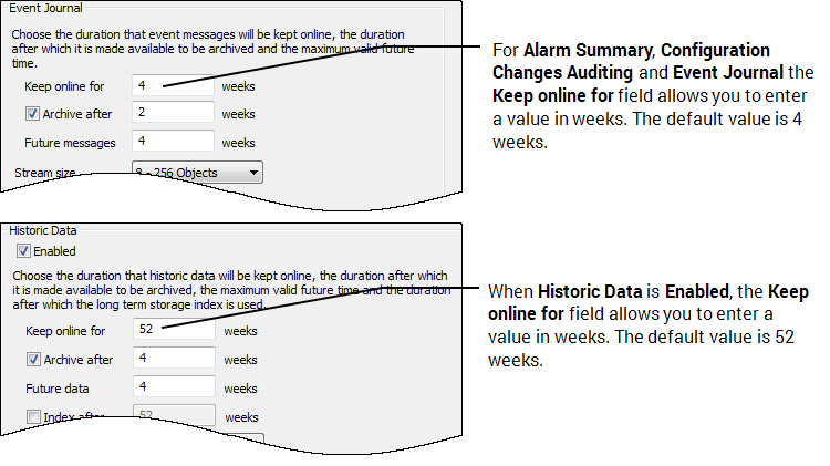 The Keep online for field in the Geo SCADA Expert Server Configuration Tool's Historic settings allows you to specify the duration that Alarm Summary, Configuration Changes Auditing, Event Journal or Historic Data., is retained online. When this period of time expires, the historic data is deleted from the disk to allow space for the latest messages or data.