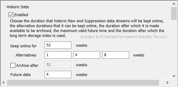 The Historic Configuration branch of the Server Configuration Tool includes a Historic Data section. This section includes the Alternatives settings. Use the settings to specify the alternative keep online periods that can be used for individual points, accumulators and profiles to keep their historic data online for a shorter period than the overall keep online period (see Specify the Life of Historic Data Storage for the Point).