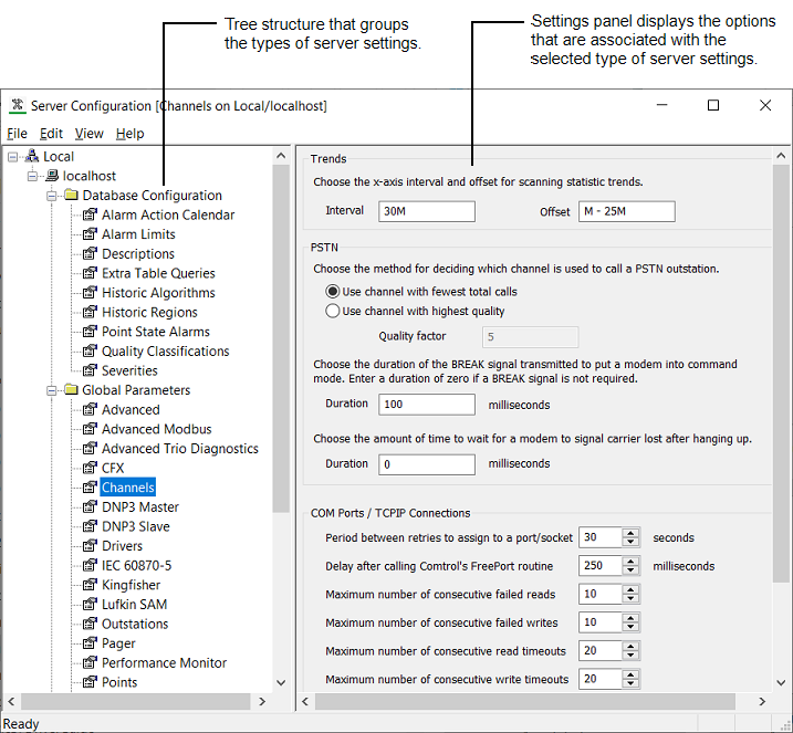 The Geo SCADA Expert Server Configuration Tool contains a tree structure that groups the types of server settings. When you select one of the groups, the relevant settings are shown in the right-hand panel.
