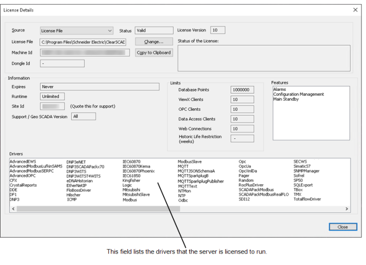 The License Details window on a Geo SCADA Expert server provides information about your license settings and the drivers, database items, clients, and so on, that are permitted on your system.