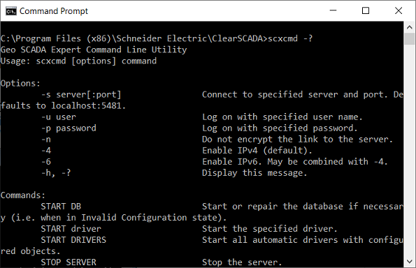 You can display a list of the commands that are available from the Geo SCADA Expert Server Command Line Tool by entering SCXCmd -h at the command prompt and pressing the Enter key. You can also display the list of commands by entering SCXCmd -? and pressing the Enter key. When you display the command list, you will see that the keyword for each command is shown along with a description of the command's function.