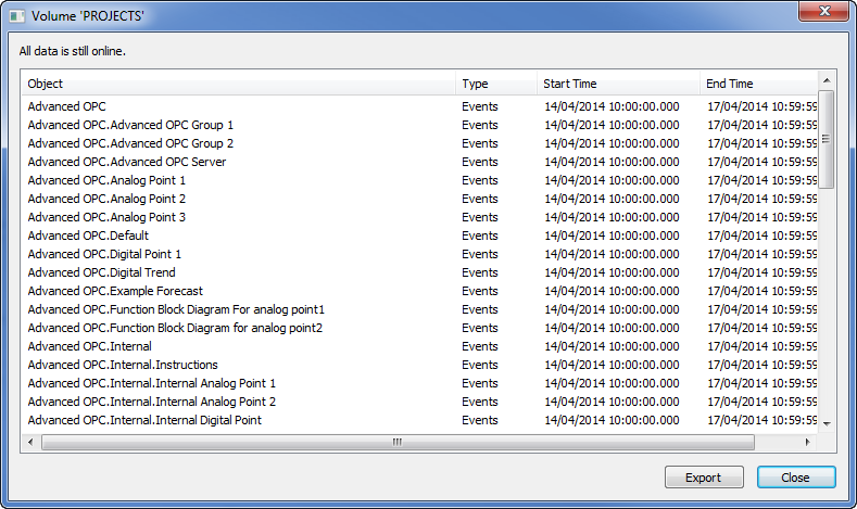 The Volume window contains a header and a list. The header, shown above the list, provides information about the amount of archived events and historic data that are still online. This information is useful when you are creating a replacement or duplicate volume as it indicates whether the data is still online. Using this information, you can determine whether the replacement or duplicate volume will contain the complete volume or only part of the volume.