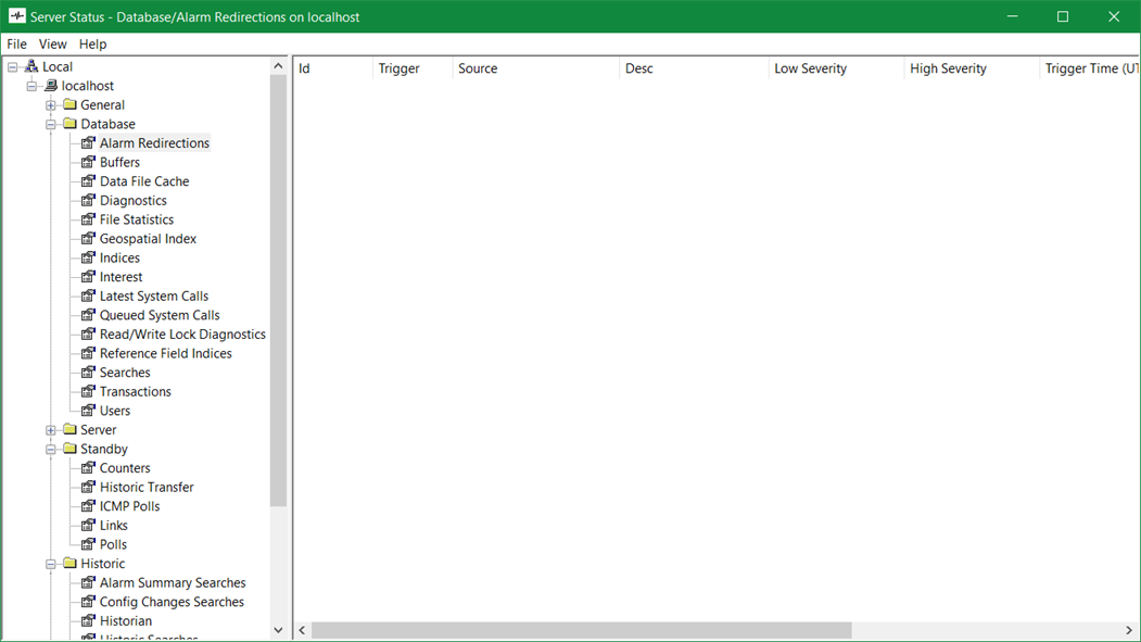 - Trigger Time (UTC)—Indicates the time (in Coordinated Universal Time) at which the pending alarm redirection will be sent. Geo SCADA Expert calculates this time by taking the time at which the alarm was raised and adding the delay that is configured for the alarm redirection (if any).