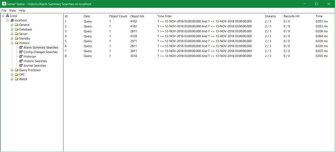 The Alarm Summary Searches category contains information regarding the searches that are currently requesting Alarm Summary data.