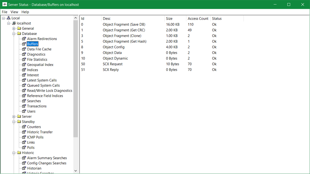 Status information about the internal buffers is shown in the Buffers category on the Server Status Tool. Typically, this information is only used by Schneider Electric engineers when investigating potential memory issues on systems with large databases.