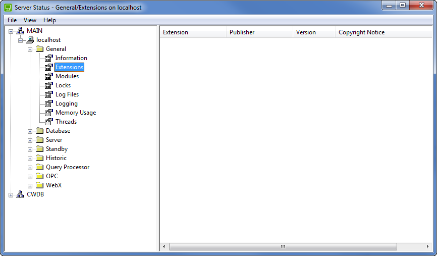 If you have installed Geo SCADA Expert but have not installed any extensions, the Extensions category has no entries. Extension status information is only shown when extensions are installed on a system.