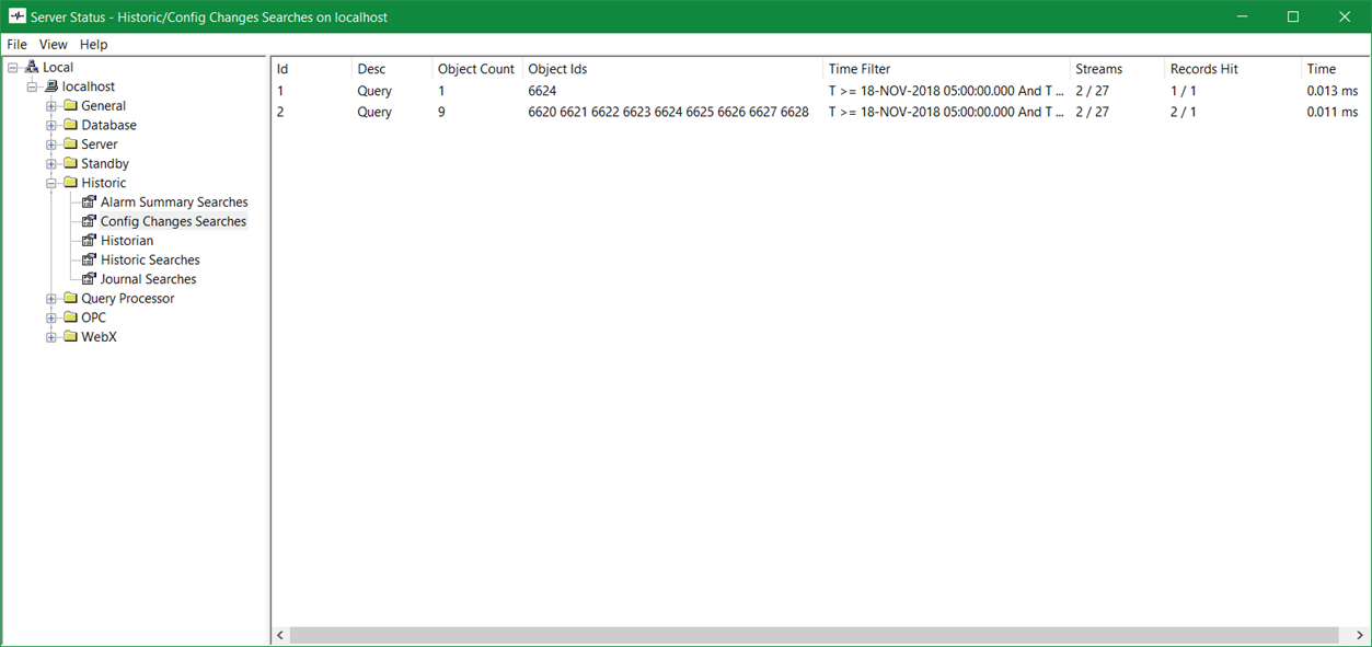 The Server Status Tool provides status information that is organized into groups of categories, each of which contains sub-categories. The Historic group provides status information about the historic and event data for the server on which you are working, including details of the historic and event searches currently active on clients that are connected to the server. The Historic group contains the following sub-categories: