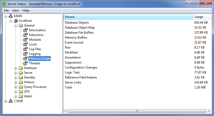 Typically, the Memory Usage statistics are useful when there are abnormal conditions on systems that have large databases and are running out of memory. By examining the statistics, you can determine which areas of the system need to be tuned so that they use less memory. A common example of this is when historic data is being logged too frequently and so there is a large amount of historic data using up the server's memory (this may result in high Raw, Modified, and Annotation memory usage).By using the Memory Usage statistics, you can identify that historic data is using too much memory and you can then alter the historic cache settings and other configuration as required.