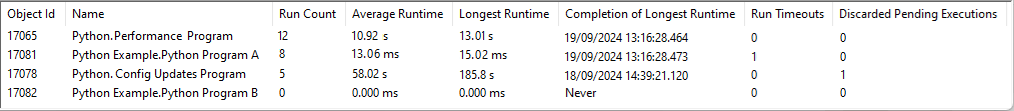 If a particular program has an unexpected number of Discarded Pending Executions, you might want to check whether any of its Trigger Conditions are causing the program to run more frequently than expected (see Define the Run Settings of a Python Program). You might also want to check the program code of the Python program (see Write and Edit the Program Code in a Python Program). For information about other checks you might want to make if a Python program has an unexpectedly high Run Count, see the Run Count entry above.