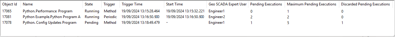 - Pending Executions—The number of further 'Run' requests of the program that are currently queued and waiting to run. Geo SCADA Expert can run several Python programs simultaneously, but can only run one instance of a specific Python program at a time. A number other than 0 (zero) in this column indicates that there are other 'Run' requests of the program in that particular program's Execution Queue, waiting to run. This might be due to the run to which the Trigger Time relates still being in progress, or that run still pending due to the server's configured Maximum Number of Running Programs having been reached (see Define the Program Limits on the Server). Geo SCADA Expert will execute the requests in the Pending Executions column in the order in which they appear in that Execution Queue, once the current run (or pending run) has finished. (Providing that the server's Maximum Number of Running Programs is no longer being exceeded.)