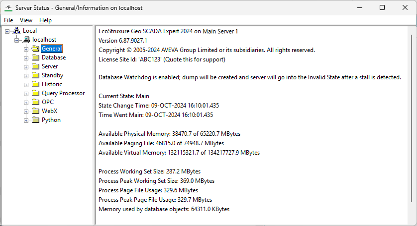 Select the required System (database) from the tree-structure that is shown on the left-hand side of the Geo SCADA Expert Server Status Tool.