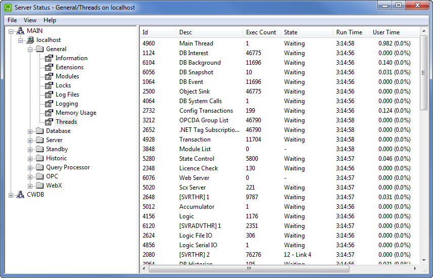 Many threads are started when the Geo SCADA Expert server is started and remain for the duration of the Database Server process's lifetime. However, the usage of a thread might vary throughout the lifetime of the Database Server process. For example, on a multi-server system, threads that support a specific standby server are initialized at the start-up of the Main server, but might not be used significantly until many hours or days later when that standby server is actually started.