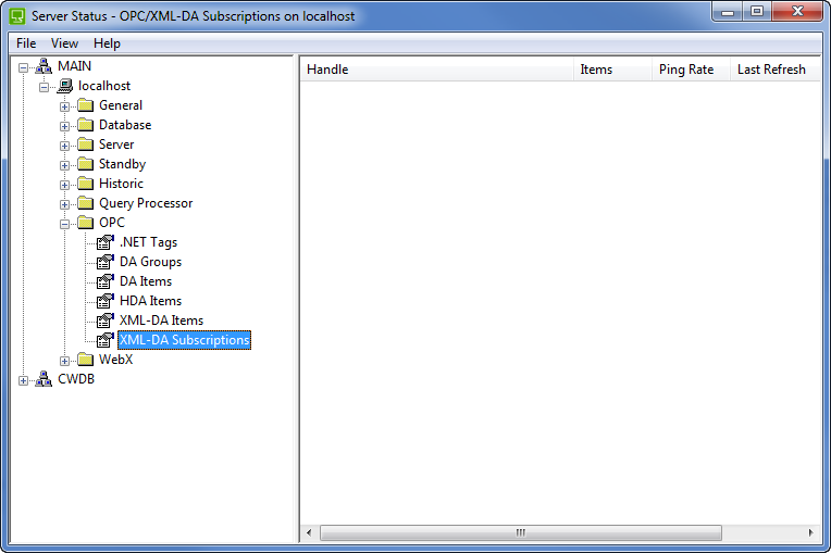 When using XML-DA to access the database, an XML-DA subscription is required. The XML-DA subscription contains information about the XML-DA tags that are being requested by a client. By using the Server Status Tool’s XML-DA Subscriptions category, you can view the status of the XML-DA subscriptions currently in use by clients (that are connected to the server.)