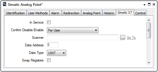 Use the fields at the top of the Simatic S7 tab to configure the Simatic S7-specific point properties. Some of these fields are common to many simple drivers (see Configure Common Point Properties in the Geo SCADA Expert Guide to Simple Drivers). Fields that are specific to analog points on the Simatic S7 driver are explained below: