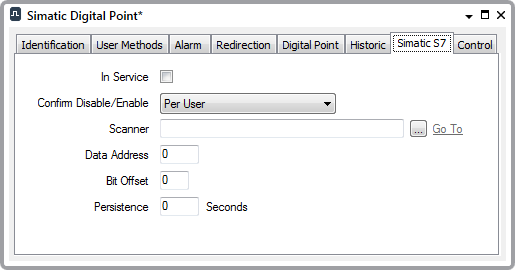 Use the fields on the Simatic S7 tab to define the Simatic S7-specific properties for a digital point. For information on those fields that are common to many simple drivers, see Configure Common Point Properties in the Geo SCADA Expert Guide to Simple Drivers. Fields that are specific to digital points on the Simatic S7 driver are described below: