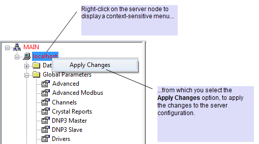 - Right-click on the server (‘node’) entry in the hierarchical list in the Geo SCADA Expert Server Configuration Tool.
