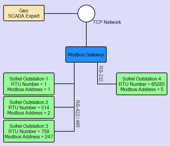 The following diagram illustrates how RTU Numbers can be assigned to generate valid Modbus addresses. All the outstations connected to the Modbus Gateway must have a unique and valid Modbus address to ensure they correctly communicate with the Modbus master (Geo SCADA Expert).