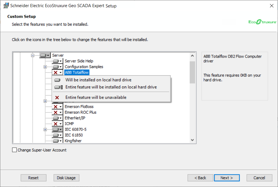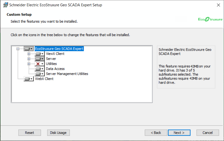 You can select the components that you want to install on the server and clients on your system; to do this, you use the Custom Setup page. On a clean installation, this page is displayed when you choose Custom on the Choose Setup Type page. When installing an upgrade of Geo SCADA Expert, this page is displayed if you select the Change button on the Upgrade page.