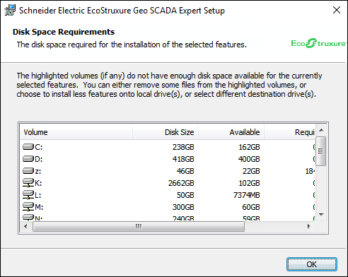 For information on the amount of disk space required for the installation you have chosen, select the Disk Usage button. This displays the Disk Space Requirements window, which shows any volumes that have insufficient space available.