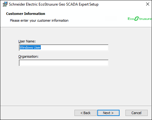 On the Customer Information page of the Geo SCADA Expert Installer, enter your name and company name in the User Name and Organization fields.