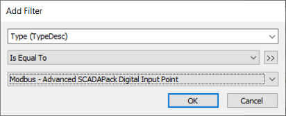 This restricts the list so that it only displays points that have a TypeDesc value of Modbus - Advanced SCADAPack Digital Input Point (points that are SCADAPack Modbus digital input points).