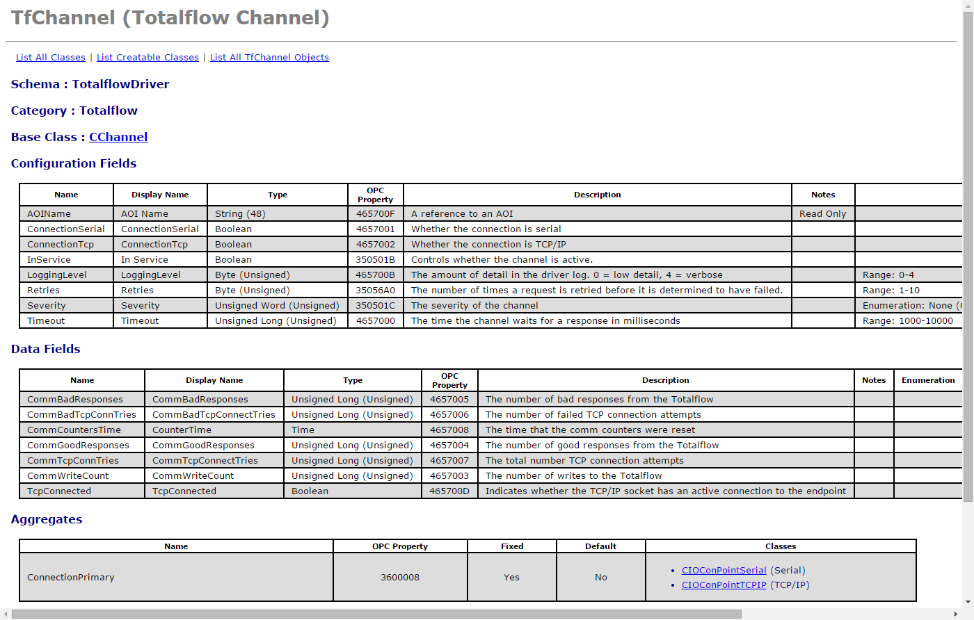 The schema for the Totalflow Channel is at: http://localhost/schema/TfChannel. The schema lists the configuration fields, data fields, aggregates, and methods, along with descriptions. The schema is generated dynamically, when the object definitions are loaded on database startup.