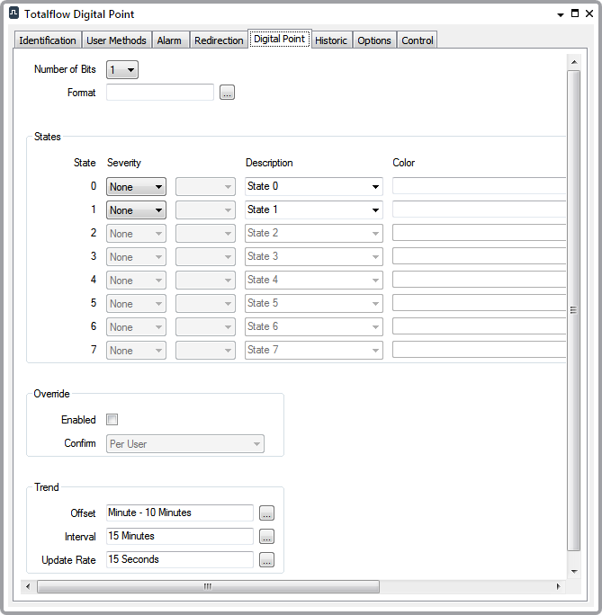 When the TreatValueAsBitfield option on the Options tab is clear, the value of the Number of Bits field has to be 1. As such, the Digital Point can only have valid values of 1 or 0. Control is limited to writing a new value of 1 or 0.
