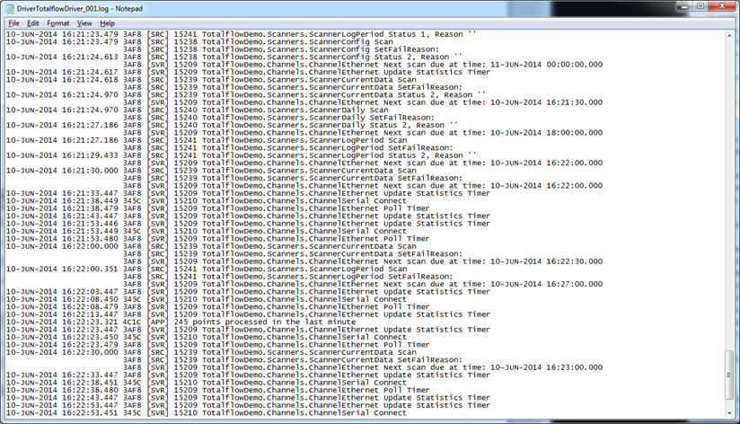 In the above figure, you can see that at 16:21:30.000 that a scanner called ScannerCurrentData starts its scan. This entry is followed by more log entries that are automatically generated by Geo SCADA Expert.