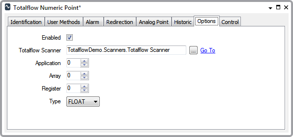 The Options tab for a Numeric Point allows you to enable the point and link it to a Scanner. Display the Properties window for a Totalflow Numeric Point object and then select the Options tab.