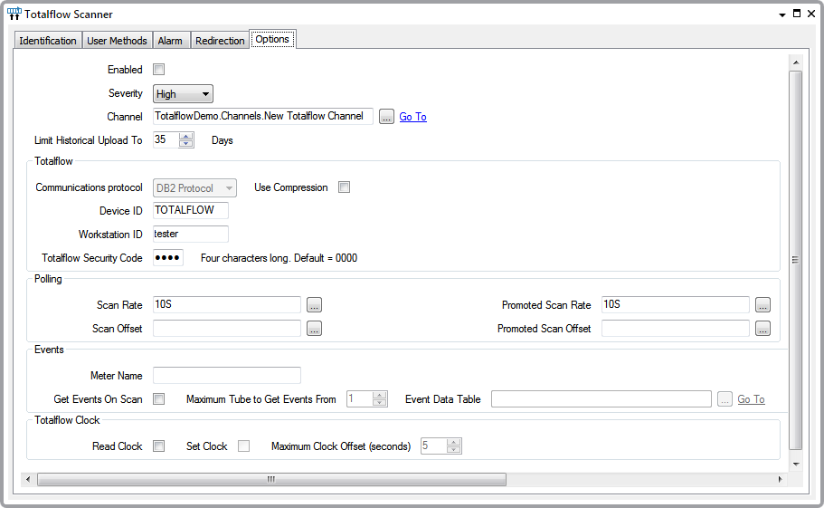To configure a Totalflow Scanner display the Properties window for a Totalflow Scanner item and select the Options tab.