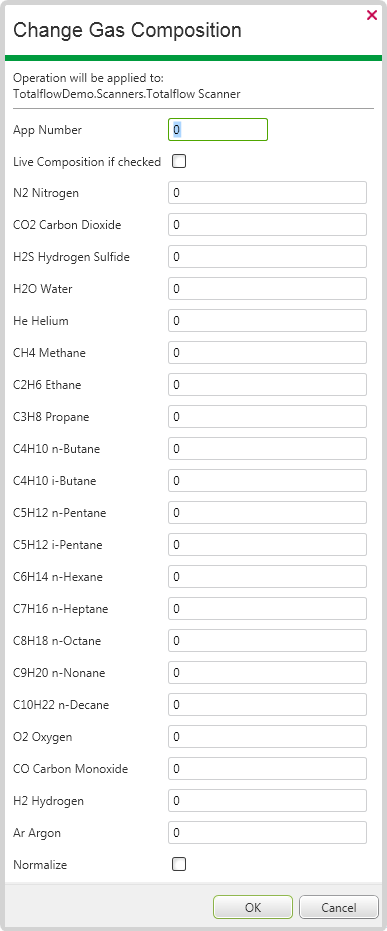 This method is also available as a pick action. As such, if your user account has the relevant permissions, you can right-click on a Totalflow Scanner object in the Database Bar, and then select the Change Gas Composition pick action. The Change Gas Composition window is displayed.