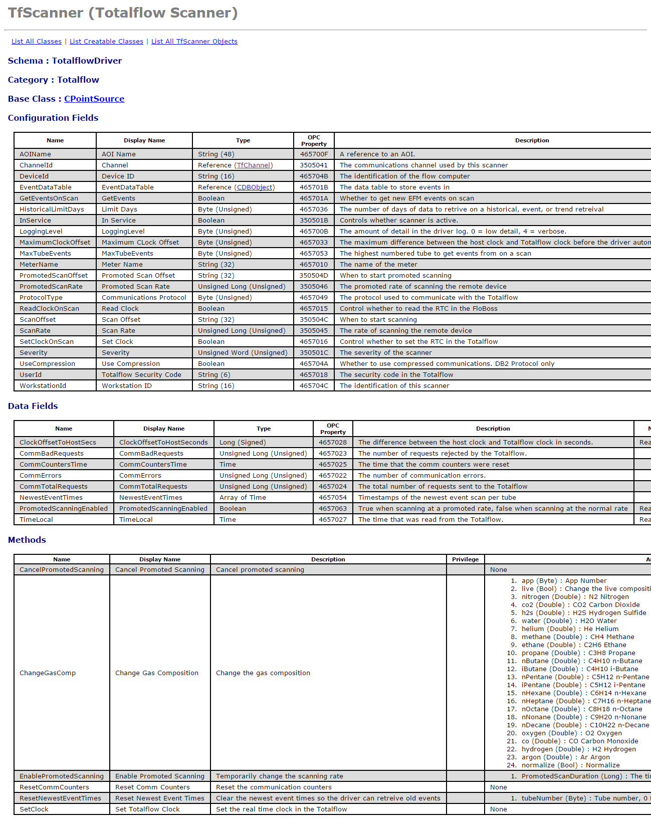 The schema for the Totalflow Scanner is at http://localhost/schema/TfScanner. The schema lists the configuration fields, data fields, aggregates and methods, along with descriptions similar to that shown below. The schema is generated dynamically, when the object definitions are loaded on database startup.