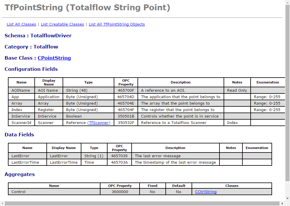The schema for the Totalflow String Point is at: http://localhost/schema/TfPointString. The schema lists the configuration fields, data fields, aggregates and methods, along with descriptions. The schema is generated dynamically, when the object definitions are loaded on database startup.