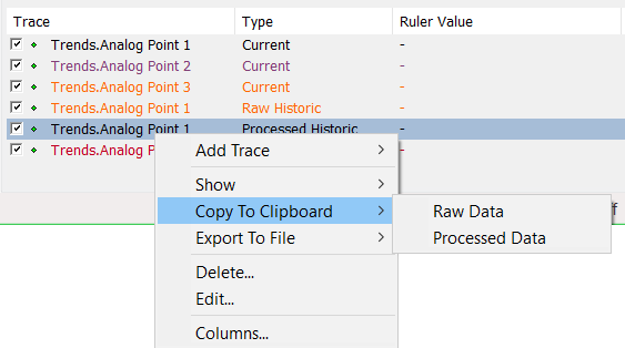 If a summary is not being used (the number of values required for the interval on the Trend is less than the Point Limit defined in the raw historic trace’s configuration), you can copy the raw data to the clipboard.