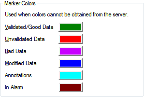 Use this section to define the default colors for the markers on a trace. The colors that you define in this section are used whenever the Trend cannot obtain the color settings from the server. Typically, this is when the data source for the trace(s) on the Trend is from a non-Geo SCADA Expert database, for example, another OPC database.
