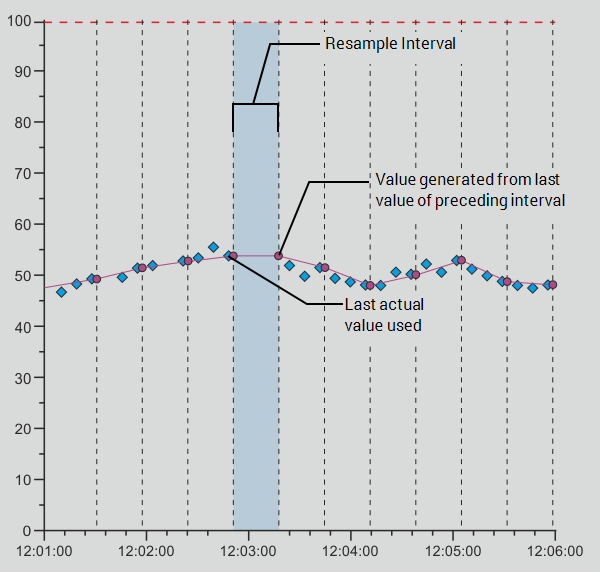 The timestamp is the time at the end of the defined resample interval, even if the actual value was taken from a sample prior to the defined resample interval. So the timestamp may not correspond with the time at which the last value was reported.