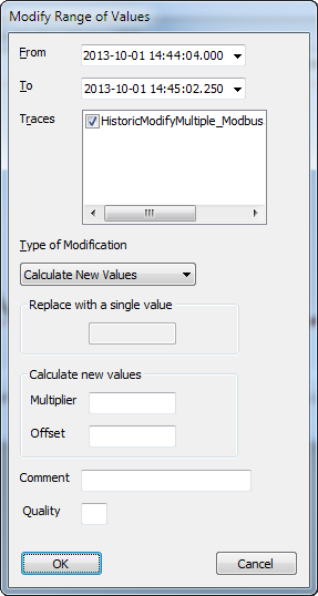 The range that you specify does not need to start or end at the actual time for which a historic value exists. Instead, Geo SCADA Expert applies the modification settings to those values that exist within the range that you specify.