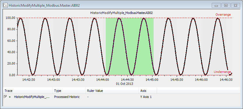 Geo SCADA Expert modifies the selected trace values according to the settings that you have specified in the Modify Range of Values window. Additionally, Geo SCADA Expert logs a message in the Event Journal for each historic value that it has modified according to those settings.