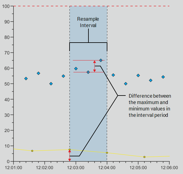 The range algorithm finds the difference between the raw maximum and raw minimum values in the interval. If only one value exists in the interval, the range is zero. The range is always zero or positive.