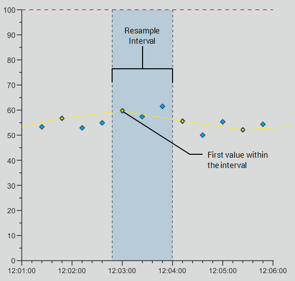 The start aggregate retrieves the first raw value within the interval, and returns that value with the timestamp at which that value occurs.