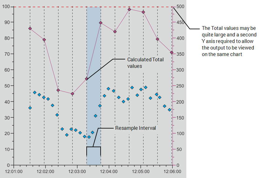 The Total algorithm is an integrated calculation that provides a total value of the data in the sample. It is especially useful with data sources that measure flow, as the result of the total calculation is equal to volume.