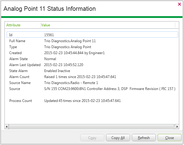 Every item in the Geo SCADA Expert database has its own Status display (also referred to as a View window or View dialog). You view an item's Status display by selecting that item's View Status pick action or menu option. The Status display provides information about the status of the selected item, presenting the information in the form of 'status attributes'. For further information about working with Status displays, see Status Displays.