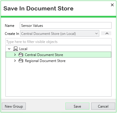 - In the Database Bar, locate the document that you want to add to one of your Operator Document Stores, then display it. For example, if you want to add a copy of a Trend named ‘Sensor Values’ to your Operator Document Store, display the ‘Sensor Values’ Trend.