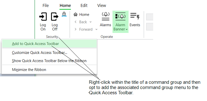 You can customize the Quick Access Toolbar by adding commands and command groups from the ViewX ribbon, or the File menu.