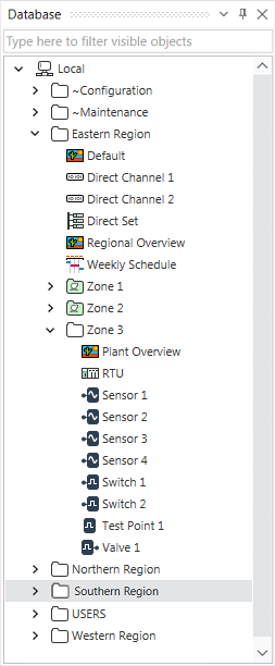 Database items are contained within groups that correspond to the Groups, Group Templates, and Group Instances that are configured in the database. You can expand individual groups to display their contents, or collapse them to hide their contents (see Working with Explorer Bars).
