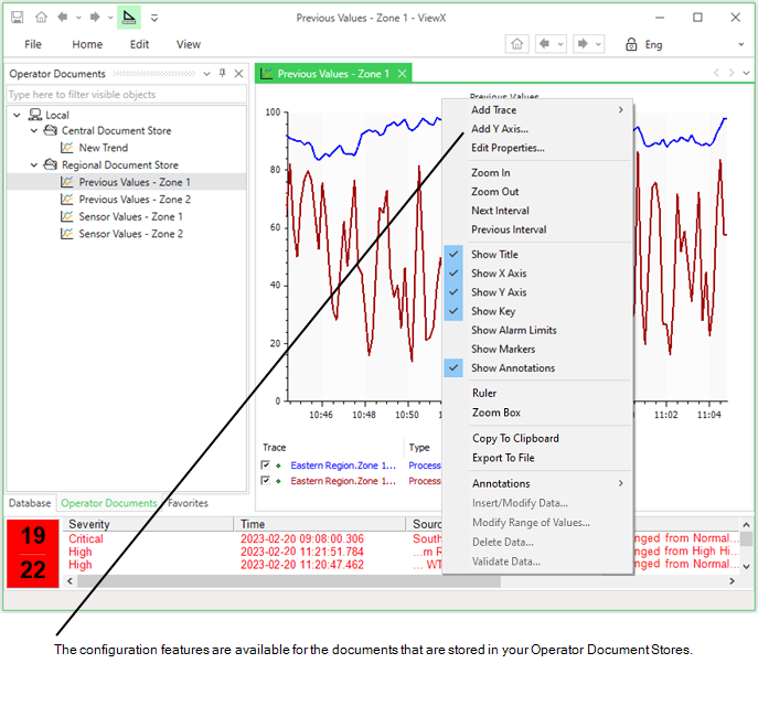 When you display a document such as a Trend in Design mode, you can access the configuration features that are normally restricted for use by engineer level users. For more information on how to configure your document, please refer to the documentation that describes the configuration process for the type of item. For example, if you have displayed a Trend, refer to the Geo SCADA Expert Guide to Trends for information on how to configure the Trend.