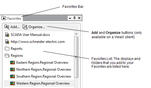 For example, by adding the Mimics, Lists, and Trends that you need to use on a frequent basis to your Favorites List (see Add a ViewX Display to your Favorites List), you can access those displays from the Favorites Barin ViewX, or the Links Bar in Virtual ViewX. You can also add web pages (see Add a Web Page to your Favorites List) and external documents (see Add an External File to your Favorites List) to your Favorites List.
