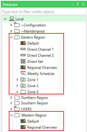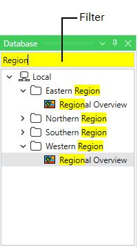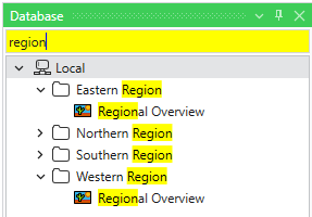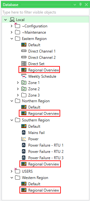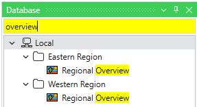 The filter is changed to specify the text 'overview' in the filter. This restricts the entries to just the 'Regional Overview' Mimics in the expanded 'Eastern Region' and 'Western Region' group folders. Despite the 'Northern Region' and 'Southern Region' group folders containing 'Regional Overview' Mimics, those group folders (and their contents) have been omitted from the Database Bar because: